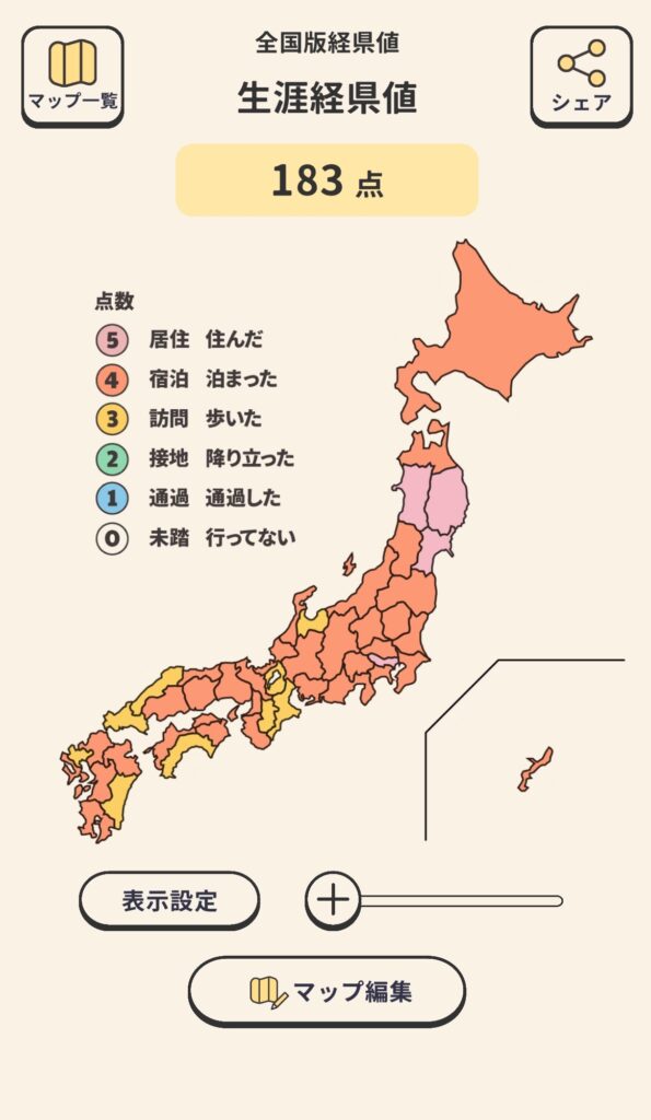 ワタシの経県値は,写真の通り183点でした。これまで住んだことがあるのは,宮城県,東京都,岩手県,秋田県の4都県です。宿泊したことがあるのは,北海道や沖縄県など34道府県。訪問したことがあるのは,残りの9県となります。10年ほど前,和歌山県を訪問したことで,全国47都道府県の踏査を達成しました。